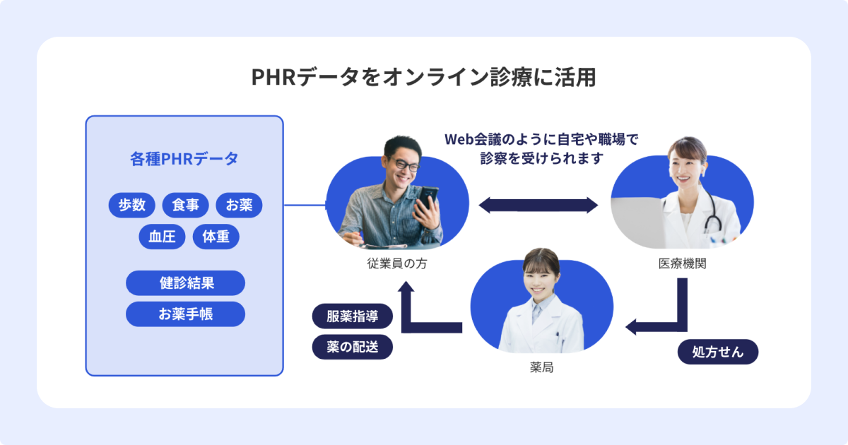 スマートワンヘルスのオンライン診療では、医師がPHRを見ながら、治療方針を立てていきます。経年の健診結果をふまえた適切な診察を行い、患者さんのリアルな生活状況、患者さんの努力、葛藤、挑戦といったメンタル面にもしっかり寄り添いながら、ともに健康への歩みを進めていくのが特徴です。
