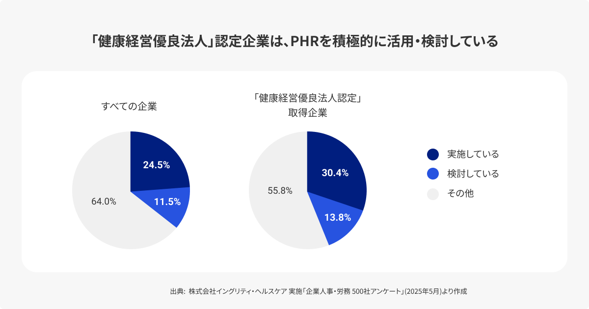 インテグリティ・ヘルスケアが実施した調査(人事・労務・総務担当者497名対象)によると、PHRの活用に「実際に取り組んでいる」企業は24.5%、「検討している」企業は11.5%にのぼり、合計で36%の企業がPHR活用に前向きな姿勢を示しています。